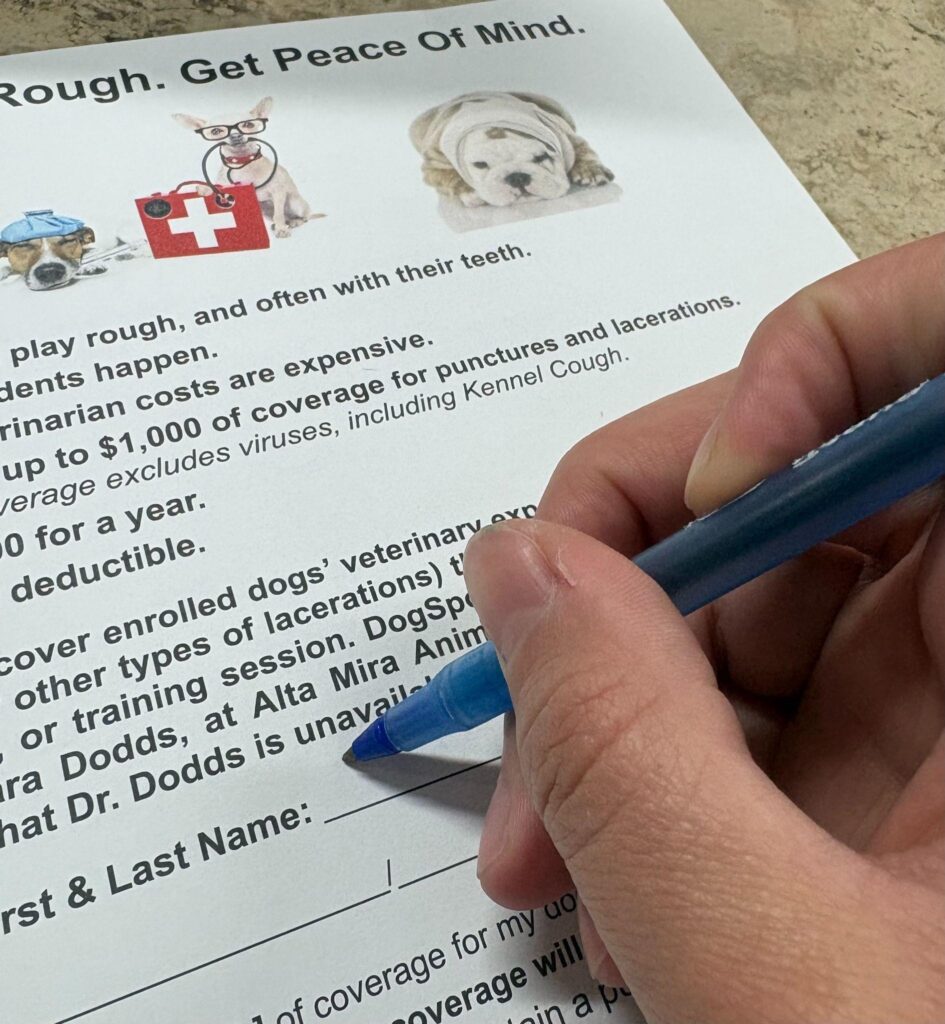 If you have pet insurance—which we highly recommend—keep in mind, there’s always a deductible. If you’re insured, we’ll pay any out-of-pocket expenses related to punctures or tears. You cannot claim from both insurers; if we cover it, it’s filed under our name. If you pay for treatment, show us the payout from the insurance company and we’ll reimburse you directly. This plan is not designed for profit—we just want to save our clients’ money and protect you from surprise vet bills. Other facilities may build this into your daily fee at check-out charging an additional fee tacked onto the boarding or daycare fee you are paying. We want to give you the option, so we highly recommend it, but it is not required.